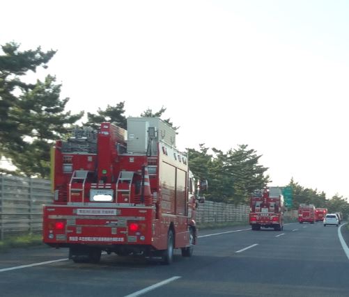 昨日ですが高速道路で消防車と救急車が列をなして台風で被害を受けた所に向かって頂いてるのだろう!