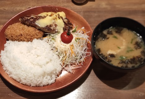 びっくりドンキーさんで期間限定メンチカツ&ハンバーグディッシュチーズトッピングいただきました(^^♪